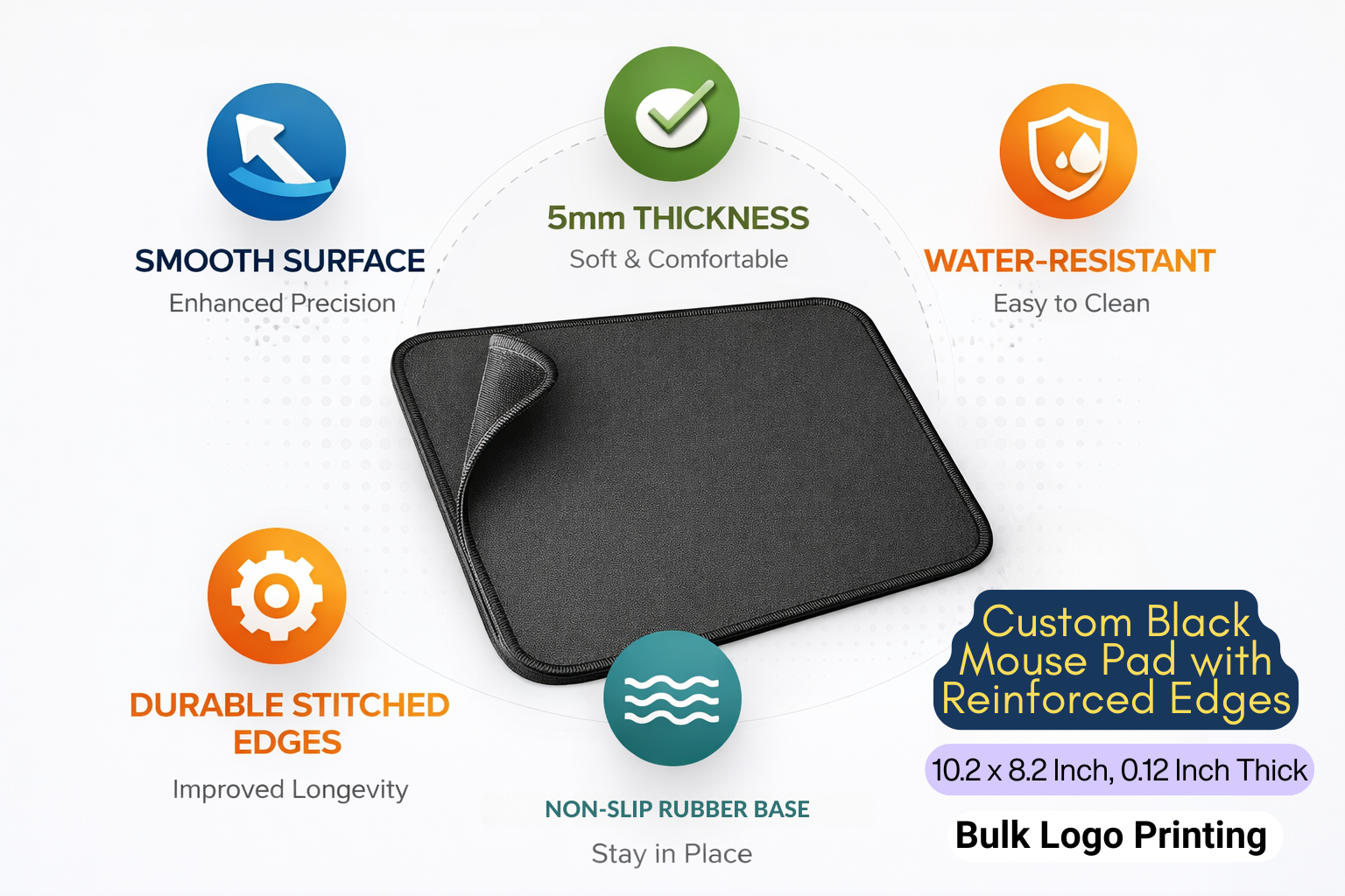 Custom Black Mouse Pad with Reinforced Edges | Bulk Logo Printing - 10.2x8.2 Inch, 0.12 Inch Thick